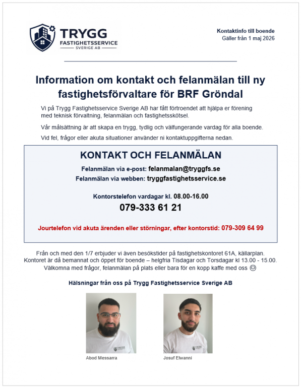 Styrelsen förmedlar här kontaktinformaton och felanmälan till vår nya fastighetsförvaltning
